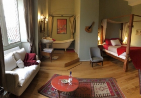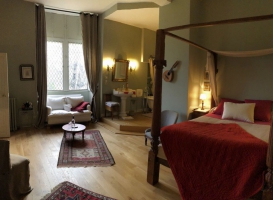 « Octavien de St Gelais »Une magnifique chambre avec son lit à colonnes et baignoire apparente, belle vue par les vitraux sur le parc.Chambre de 28 m2 avec TV, salle de bain ouverte et WC.