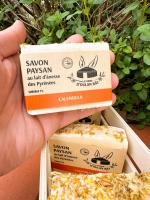 La saponification à froid est une méthode artisanale et ancestrale de fabrication de savons surgras riches en glycérine naturelle et permettant de conserver les bienfaits des ingrédients utilisés. Les savons sont très adaptés pour les peaux les peaux sensibles.Le lait d'ânesse ajoute encore plus de douceur. Céline et Nicolas utilisent uniquement du lait frais de la ferme. Les ânesses sont traites une seule fois par jour pendant quelques semaines au moment du sevrage des ânons. Ils utilisent la traite pour faire un sevrage progressif des ânons et ils prélèvent uniquement ce qu'ils ont besoin. Les ânons sont ensuite éduqués pour être vendu à partir de 4 ans comme âne de travail. Le lait d'ânesse est riche en vitamines et minéraux. Très hydratant pour la peau, il la nourrit en profondeur. Il apaise même les peaux les plus sèches, sensibles et réactives.Pour l'huile d'olive, Céline et Nicolas sont partis dans l'Aude chez un producteur installé en agriculture biologique. Lionel produit une huile de grande qualité obtenue par pressage à froid. Autant passionné par la culture des oliviers que par la production d'huile, c'est une huile d’exception.Céline et Nicolas produisent leur calendula sur l'exploitation en traction animale. Il est ramassé à la main pour produire leur propre macérât huileux et en faire sécher une partie pour embellir le savon au calendula. Cette fleur est reconnue pour ses propriétés hydratantes et antioxydantes avec un rôle permettant de protéger et d'apaiser.Le charbon actif végétal qu'ils utilisent provient de bois carbonisé puis activé à la vapeur. Le bois est issu de forêts éco gérées française certifiées PEFC et BIO.Ils prélèvent le saindoux lors de la transformation de leurs cochons. Ils élèvent du porc gascon en plein air uniquement pour leur consommation et la table d'hôte. (Uniquement pour le savon au Charbon)Le miel et la cire d'abeille viennent de producteurs du village. C'est un miel de montagne, naturel et artisanal.Nicolas et Céline utilisent de l'eau thermale des Pyrénées provenant d'une source proche de chez eux. Elle est réputée pour être cicatrisante, parfaite pour les peaux fragiles.Commercialisation : en vente directement à la ferme tous les jours (sur rendez-vous) ou possibilité d’envoi par la poste et à La Boutique de l'Ot à Aspet, Saint-Martory et Salies-du-Salat.