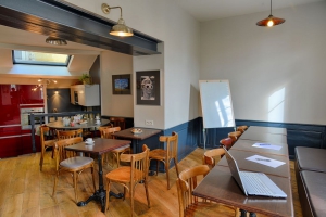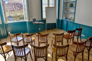 Au-dessus du salon de thé, un magnifique escalier d'époque mène vers 2 salles de réunion, non communicantes, entièrement modulables et équipées. Celles-ci peuvent accueillir chacune entre 12 et 18 personnes personnes en fonction de la configuration souhaitée. Accès terrasse privative. Possibilité de pause gourmande avec les macarons de la Biscuiterie. Livraison de plateaux repas possible sur place pour déjeuner.