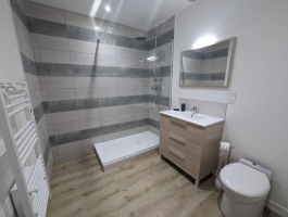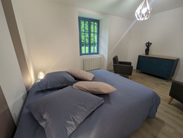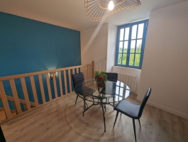 Gîte appartement au premier étage avec cuisine et coin repas en mezzanine. Salle d'eau et toilettes. Chambre avec un lit en 140 et coin salon.1 cafetière filtre