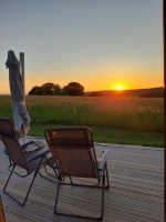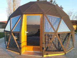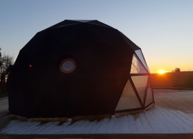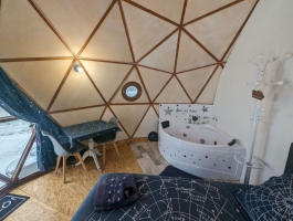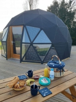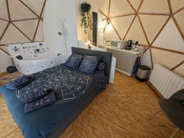 Dôme géodésique de 20m2 au calme et confortable. Tranquillité assurée pour se reposer avec toit panoramique pour s'endormir sous les étoiles. Lit double prêt (x140) . Terrasse avec vue sur la campagne, transats à la belle saison. Baignoire balnéo pour se détendre. Petit coin cuisine pour se restaurer notamment micro onde combiné. Toilettes sèches et climatisation. Table enceinte bluetooth.Linges de lits et de toilette fournis tout comme des masques de nuit.