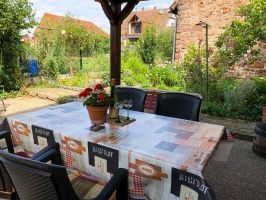 Maison située dans la cour du propriétaire dans un cadre de verdure. Rez-de-chaussée : séjour donnant sur une terrasse couverte de 20m², cuisine, salle d'eau, wc. Etage: 1 chambre 1 lit 2p (+lit bébé), 1 chambre 2 lits 1p.Chauffage électrique en sus sauf Noël et week-end. Location de draps. Parking, mobilier de jardin. Wifi gratuite.