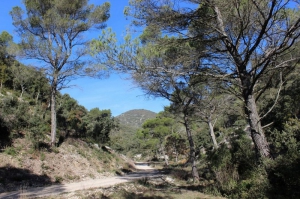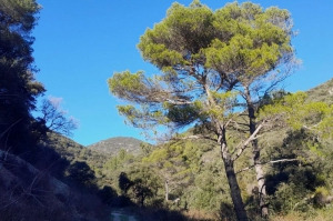Une série de Pin d'Alep ou Pin blanc de Provence (Pinus halepensis) se dressent fièrement tout au long du vallon de Recaute. Originaire du bassin méditerranéen, il apprécie les conditions climatiques de basse altitude et supporte de très faibles précipitations. Très commun dans le Luberon, il se reconnait à sa ramure légère et sa silhouette penchée et tortueuse. Autrefois, exploité pour sa résine, on retrouve encore sur certains arbres des traces de cette exploitation (plaies ouvertes pénétrant le bois des troncs).