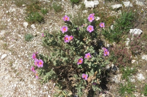 Facilement reconnaissable par ses innombrables fleurs rose-violet chiffonnées et ses feuilles au revêtement duveteux, le ciste cotonneux (Cistus albidus), appelé Mussugo en provençal, est un petit arbuste typique de nos garrigues, pouvant atteindre 1 m de hauteur. Ses feuilles recouvertes d’un duvet, retiennent l’humidité et font glisser le vent dessus sans l’assécher. Lors de la floraison, au mois de mai, on peut observer ses fleurs qui ne durent pas plus de la matinée. Elle réapparaisse ensuite le jour suivant et le processus recommence.