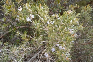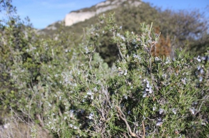 Avec ses fleurs bleues, parfois blanches, le romarin (Salvia rosmarinus) égaye la saison hivernale par sa floraison précoce et abondante dès février, et même avant si les conditions sont bonnes. Habitué des garrigues à calcaire, il fait face à une grande sécheresse l’été qu’il affronte grâce à ses petites feuilles étroites et longues repliées sur elles-mêmes. Les feuilles contiennent les organes de transpiration et cette forme permet de diminuer au maximum les déperditions d’eau.