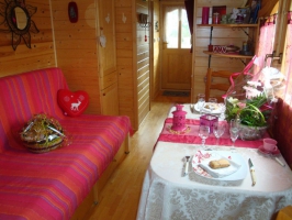 Pouvant accueillir jusqu'à 4 adultes, elle comprend salle d'eau (douche, wc et lavabo), kitchenette équipée (frigo, plaques halogènes, hotte aspirante, micro-ondes et vaisselle complète), climatisation réversible (été-hiver), literie complète de qualité supérieure (drap et linge de toilette fournis), mobilier de jardin et barbecue. Possibilité de dîner gastronomique aux chandelles dans la roulotte (idée cadeau, anniversaire de mariage, St Valentin...).
