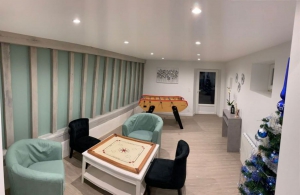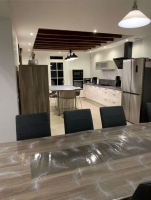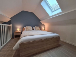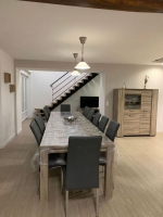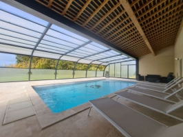 En rez-de-chaussée : entrée avec vestiaire - grande pièce de vie avec cuisine équipée, coin repas et salon (poêle à pellets) - pièce de jeux (baby-foot et table de jeux de carte) avec accès à la piscine - chambre (lit 160 cm et 1 lit 1 personne) avec salle d'eau (2 vasques et une douche) et wc indépendant privatif - buanderie avec nombreux rangements et wc indépendant. A l'étage : palier avec coin détente - chambre dortoir avec 2 lits 1 personnes et 2 autres lits 1 personne en mezzanine - chambre avec lit de 160 cm et 1 lit 1 personne - chambre avec lit de 160 cm et un autre lit de 160 cm en mezzanine - wc indépendant - 2 salles d'eau (2 vasques et douche). Grande terrasse et parking sur la propriété.