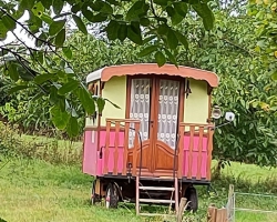 Séjour dans une roulotte ayant réellement sillonné les routes, installée dans un espace verdoyant planté de pommiers, parfois accueillant des moutons ou un cheval de trait. Hébergement insolite, entre bohème et poésie, simple, pour les amateurs de tourisme vert et authentique. Petit équipement pour cuisiner individuellement dans la roulotte, avec accès partagé à la cuisine, au salon, à une salle de bain et WC dans la maison principale.Chaque roulotte peut accueillir 2 personnes.