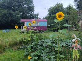 Séjour dans une roulotte ayant réellement sillonné les routes, installée dans un espace verdoyant planté de pommiers, parfois accueillant des moutons ou un cheval de trait. Hébergement insolite, entre bohème et poésie, simple, pour les amateurs de tourisme vert et authentique. Petit équipement pour cuisiner individuellement dans la roulotte, avec accès partagé à la cuisine, au salon, à une salle de bain et WC dans la maison principale.Chaque roulotte peut accueillir 2 personnes.