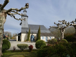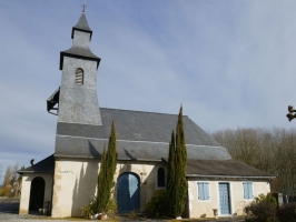Cet édifice se situe sur l'emplacement d'une église médiévale dont elle reprend le plan simple : allongé à vaisseau unique, portail sud daté en 1709, verrières réalisées à Pau par P. Arcencam en 1923.