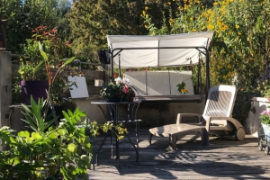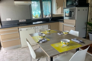 Aux confins Bresse - Dombes - Bugey, appartement de 57 m² en rez-de-chaussée surélevé, mitoyen à la maison du propriétaire avec entrée indépendante. Séjour avec canapé convertible 160 cm, télévision LCD, accès Internet Wifi fibre gratuit, cuisine équipée donnant sur la terrasse (micro-ondes, lave-linge et lave-vaisselle), une chambre à l'étage avec deux lits électriques de 90 par 180 réunissables en un seul grand lit, une chambre au rez-de-chaussée avec 2 lits de 80 par 200 réunissables en un seul lit. Lit et matériel bébé, salle d'eau avec double vasque, WC séparés. Chauffage électrique par géothermie et climatisation réversible. Parking, cour fermée avec étendage à linge. Jardin ombragé agrémenté d'un salon de jardin et d'un barbecue, balançoires, bac à sable et cabane, piscine 5x10 m abritée et chauffée en mi saison (nage à contre-courant et aquabike). Abri voiture et borne de recharge pour véhicule électrique, local fermé pour vélos. Terrasse fermée. Possibilité location draps/linge de toilett. Animaux admis sur demande avec supplément. Pérouges 15 km, parc des Oiseaux 20 km, Bourg-en-Bresse 30 km, Lyon 40 km, St Vulbas 20 km.
