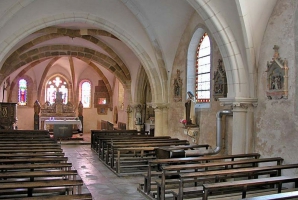 Le chœur de l'église de la Nativité-de-la-Vierge date de la seconde moitié du 15e siècle. La tour du clocher porte la date de 1538 sur un relief encastré au niveau de son portail. C’est un édifice à plan en croix latine. La nef à vaisseau unique de deux travées est suivie d'un transept saillant. La façade occidentale est occupée par une tour-porche couronnée d'une flèche polygonale en ardoise. Le chœur se compose d'une travée droite et d'une abside à trois pans couvertes d'une voûte d'ogives à six quartiers. Une armoire eucharistique est ménagée dans le pan sud-est de l'abside et le flanc nord de la travée droite est accosté par la sacristie au toit en appentis. Chapelle avec oculus et piscine du XVIe siècle, inscrite sur l'Inventaire Supplémentaire des Monuments Historiques le 21 novembre 1925.
