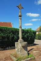 Ainsi que le calvaire de la Rue du Mont que nous avons vu, et celui de Pré Firon (sur la D282 en contrebas vers la route de Nancy avec son abreuvoir), ce calvaire fait partie de l'ensemble des croix périphériques au village, qui délimitait autrefois l'espace béni et protecteur dans lequel il était permis de construire.|Il a été érigé le 5 août 1779 par Rémi Bacquias et Jeanne Hugueny sa femme. Rémi Bacquias, alors agé de 47 ans, était greffier en la justice de Peigney pour le compte des chanoines. C'est un des calvaires les plus élégants de la région de Langres, avec un piédestal massif à console surmonté par une colonne effilée, sur laquelle repose une fine croix rehaussée aux branches fleurdelisée, dont le centre encadré par quatre esses, devait porter l'image du Christ en croix côté Langres (disparu) et la couronne d'épines du côté du village.