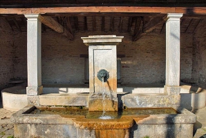 Tout comme la fontaine à colonne non loin du lavoir, l'eau de ce dernier jaillit par une goulotte sortant du bec verseur zoomorphe qui prend également la forme de la gueule d'un lion, souvent représenté dans la région. De cette base carrée et moulurée, l'eau se jette dans un premier bassin extérieur avant de s'écouler dans le lavoir couvert. Les 2 pans de toit sont suportés par une joilie charpente reposant sur 3 cotés de mur en pierre et sur 2 piliers carrés et moulurés sur le 4ème coté ouvert sur la rue.