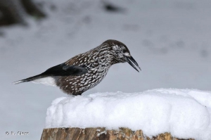 A l’automne, le cassenoix moucheté peut cacher près de 100 000 graines dans la forêt sous les feuilles, les racines, la mousse dans le sol…Ce sont ses réserves pour l’hiver. Pour cela, comme plusieurs oiseaux , il a un jabot : une poche avant l’estomac. Cet organe de l'appareil digestif chez plusieurs groupes d'animaux est destiné à : - transporter en plus grande quantité;- constituer une réserve temporaire d'aliments qui sera digérée plus tard ;- humidifier des aliments. Cela est particulièrement pratique pour les oiseaux granivores qui sont souvent amenés à ingurgiter de grandes quantités de grains secs qui sont difficiles à digérer sans une humidification préalable.