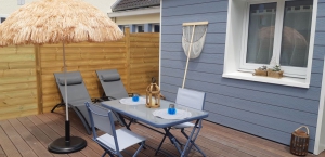 Ce cocon de charme, complètement rénové, à la déco raffinée "bord de mer" et "bohème" , se situe en centre ville, à proximité des commerces et de la plage (à 10 mn à pieds). Stationnement sur place avec parking sécurisé gratuit avec badge et place réservée. Cette maisonnette qui dispose d'un patio exposé plein sud avec sa terrasse bois, est composée au rdc d'une pièce de vie avec cuisine équipée, sdb douche à l'Italienne, wc, buanderie. A l'étage salon avec tv, wifi et 1 chambre 2 pers.