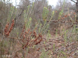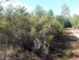 Appelée aussi « grande bruyère », on la trouve beaucoup dans cette zone non calcaire. Ses petites fleurs verdâtres sortent de mai à juin. Si elle est moins visible par endroits ou à certaines saisons, on peut la retrouver dans le nom des lieux : « Brus » et « Brùgi », ses noms en provençal, ont donné Brugière, Brousses, Piébroux (colline aux bruyères). Son nom français fait référence à une époque où elle était très utilisée pour fabriquer des balais. Elle servait aussi à la fabrication de claies.