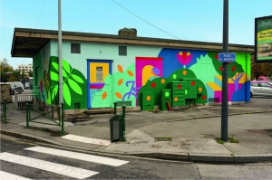 Sur cette fresque, un personnage féminin évolue dans un décor où cohabitent harmonieusement la nature et la ville.Elle parcourt la ville à vélo ou à pied, sous un ciel dégagé, au pied d’habitations aux lueurs réconfortantes et de portes magiques ouvrant vers d’autres horizons.La palette colorée apporte fraîcheur, évasion et gaîté. La ville se charge de motifs abstraits et énigmatiques, comme des symboles et des armoiries simplifiées. Les colonnes et portes stylisées évoquent subtilement une architecture à la fois contemporaine et historique. Une nouvelle figure féminine se fond dans le paysage et sa chevelure se transforme en buisson sur le mur suivant.CHLOÉ WEINFELDChloé Weinfeld est une illustratrice établie à Lyon. Elle peint à la gouache des scènes surréalistes à la végétation luxuriante et aux tonalités éclatantes, influencée par son enfance passée à la Réunion et ses nombreux voyages.Ses compositions marient architectures rêvées et nature indomptée, au gré d’explorations imaginaires. Son univers reste profondément marqué par les riches paysages de l’île de son enfance, terre de contrastes où la lumière intense sculpte les volumes et ravive les couleurs.Captivée par l’idée d’une nature qui reprend ses droits à travers les récits et images de cités disparues puis retrouvées, ses peintures sont une invitation à l’évasion et à la rêverie.