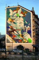 Le travail figuratif de Ratur interroge sur les relations qu’entretiennent les artistes issus dugraffiti et les grands genres picturaux classiques. Il met en scène des personnagesde manière contemporaine, qui semblent vouloir rester anonymes.Ce titre évoque plusieurs éléments :Vestiges : Ce mot évoque ce qui reste d’un passé, des fragments ou des souvenirs. Cela fait écho à l’idée de la sculpture brisée, suggérant que, même dans l’incomplétude, il y a encore de la beauté et une connexionà ce qui a été.Aurore : Cela fait référence à l’aube ou à un nouveau départ, symbolisant la renaissance et la lumière. Dans le contexte de la nymphe qui renait du feuillage, cela renforce l’idée de régénération et d’espoir. Cette oeuvre murale puissante dépeint une nymphe dont le visage semble partiellement brisé, comme une sculpture ancienne marquée par le temps. Pourtant, des fragments manquants renaissent à travers un feuillageluxuriant qui jaillit du haut de son visage, symbolisant la résilience de la nature. Ses traits, bien qu’incomplets, dégagent une majesté intemporelle, faisant d’elle une véritable icône. Elle incarne à la fois la fragilité et la force,une figure mythique transcendante qui évoque la manière dont la nature, malgré les épreuves, reprend toujours ses droits et se régénère avec une beauté indomptable.RATUR(Arthur Maslard) est né au Havre en 1983.