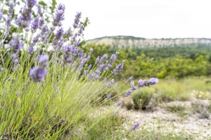 La lavande aspic (Lavandula latifolia), à larges feuilles blanchâtres, est une plante des étages méditerranéens. La lavande fine (Lavandula angustifolia) à feuilles étroites, est quant à elle plus montagnarde (au-dessus de 600 m et jusqu'à 1500 m d'altitude), comme ici sur ces coteaux. Mais ordinairement, c'est le Lavandin, hybride des deux et plus productif, qu'on observe en juin et juillet dans les champs en Provence. Ces cultures sont le fruit d'un dur travail agricole, merci de ne pas cueillir !