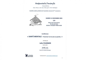 Samedi 13 décembre 2025A 15h à la Maison des associations.Conférence "Santé mentale : traverser la vie sans se perdre"Animée par Julie Fournier.Entrée : 10 € (50% au profit de l'EPEAM).Samedi 21 mars 2026A 15h à la Maison des associations.Conférence Votre mentale "Après un accident de vie"Animée par Aline Herbaut.Entrée : 10 € (50% au profit de l'EPEAM).