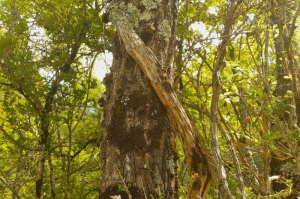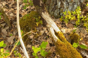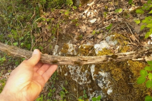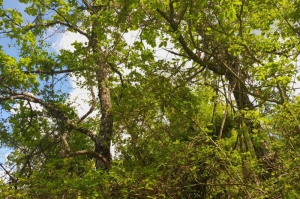 Dans le virage du sentier, de grandes lianes accrochées aux chênes donnent à cette chênaie un air de forêt primaire. Il s’agit de la Clématite des haies, ou Vigne blanche (Clematis vitalba). Comme son nom l’indique, cette renonculacée affectionne particulièrement les haies, mais elle pousse aussi dans les broussailles et les clairières fraîches. Parfois rampante, mais principalement grimpante, elle peut atteindre jusqu’à 15 m de long. Peu d’espèces animales la consomment, car sa sève fraîche provoque des ulcérations.