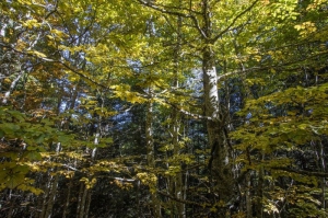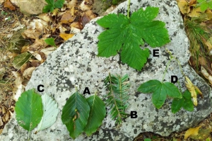 Ici, la forêt que l'on traverse est dite "hêtraie-sapinière". Elle est composée majoritairement de hêtres (A) et de quelques sapins (B). Mais on peut également y rencontrer d'autres arbres, comme l'alisier blanc (C) de la famille des sorbiers, le cytise faux ébénier (D) aux belles grappes de fleurs jaunes (toxiques!) au printemps, ou l'érable sycomore (E). Avec un peu d'attention, vous pouvez les reconnaître à la forme de leurs feuilles, présentées sur la photo jointe.