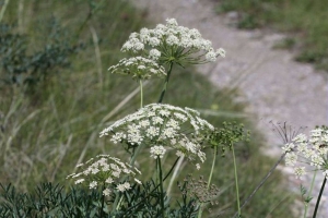 Après le pont, sur une petite barre rocheuse à droite de la piste, s’accroche une grosse plante à l’inflorescence en forme d’ombelle, (autrement dit, d’ombrelle), le laser siler. Cette plante de la famille des apiacées, nommée auparavant ombellifères, vit dans les zones sèches. Elle a une particularité : en automne, la tige se casse toute seule dans sa partie basale et toute la plante, sèche, part en une grosse boule, roulant dans les pentes ou poussée par le vent.
