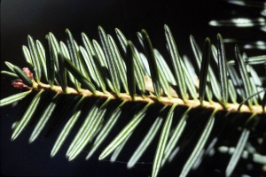 Quelques résineux, dont le sapin, se mêlent aux feuillus. Le sapin se plaît sur ce versant exposé au nord, nommé ubac, car il craint la sécheresse. Ses aiguilles planes sont implantées de part et d’autre des rameaux et non tout autour, ce qui le distingue de l’épicéa. Elles ont deux bandes blanches en dessous. Ses cônes allongés sont dressés et non pendants.