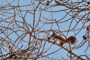 Avec élégance et vivacité, un écureuil suivi de son long panache traverse la piste. Roux ? Celui-ci est plutôt brun foncé. En montagne, on adopte la stratégie du panneau solaire, noir pour mieux absorber la chaleur. Ce rongeur est actif le jour et n’hiberne pas, même s’il réduit son activité les jours de mauvais temps. C’est une espèce protégée.
