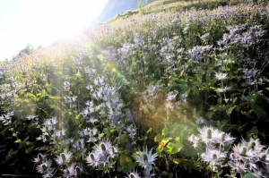 Le vallon du Fournel est bien connu pour abriter le plus grand site des Alpes de chardons bleus. Cette réserve se situe aux Deslioures, au bout de la route. Cependant d'autres localités existent dans le vallon, comme ici. Cette espèce rare s'étant adaptée aux prairies de fauche d'altitude, des mesures agro-environnementales de report de pâturage ou de fauche tardive en fin d'été sont pratiquées afin qu'elle ait le temps de fabriquer ses graines.