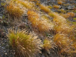 Sur le talus pousse une graminée formant de grosses touffes : la calamagrostide argentée. Elle est adaptée aux terrains caillouteux, secs et ensoleillés. Ses inflorescences aux reflets dorés argentés sont du plus bel effet mais c'est surtout à la fin de l'été qu'on la remarque lorsque, dans la lumière du soir, elle forme de gros bouquets chatoyants.