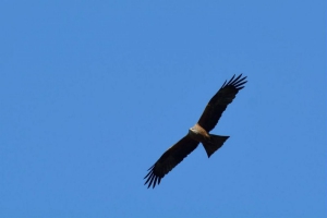 Un rapace tourne lentement au-dessus de la vallée. Il est sombre avec une queue légèrement échancrée. Un milan noir, revenu d'Afrique au printemps. Il se nourrit de charognes ou de déchets ainsi que de poissons. On peut le confondre avec le milan royal, marron, roux et blanc avec une queue beaucoup plus échancrée. Ce dernier ne niche pas dans le massif. C'est seulement pendant les périodes de migration que l'on peut l'observer dans la vallée de la Durance.