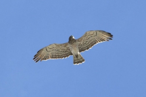C’est en mars que ce grand rapace brun sur le dessus et blanc moucheté de noir en dessous, avec la tête sombre, revient d’Afrique subsaharienne où il a passé l’hiver. Il se nourrit surtout de reptiles qu'il chasse dans les zones steppiques ou dénudées, les friches ou les pierrailles. Il construit son nid dans un pin où grandira un seul poussin. On peut facilement l’observer faisant du surplace dans les airs, à une trentaine de mètres du sol, puis fondre sur sa proie.