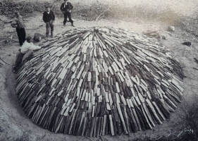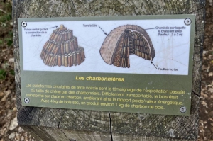 Les plateformes circulaires de terre noircie que l'on devine en chemin, sont le témoignage de l’exploitation passée du taillis de chêne par des charbonniers. Difficilement transportable, le bois était transformé sur place en charbon, améliorant ainsi le rapport poids/valeur énergétique. Avec 4 kg de bois sec, on produit environ 1 kg de charbon de bois. Les charbonniers vivaient sur leur lieu de travail, parfois en famille, dans des cabanes sommaires aujourd'hui disparues.
