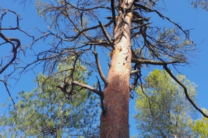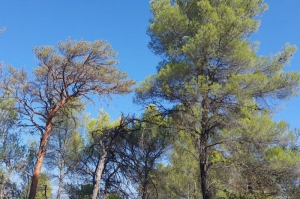 Une procession élégante de Pins d’Alep, aussi appelés Pins blancs de Provence (Pinus halepensis), s’élève avec majesté. Originaire du bassin méditerranéen, cet arbre s’épanouit en basse altitude, résistant à la sécheresse. Emblématique du Luberon, il se distingue par sa ramure aérienne et sa silhouette tourmentée, souvent inclinée par le vent. Jadis exploités pour leur résine, certains spécimens portent encore les cicatrices de cette époque, leurs troncs marqués par d’anciennes entailles profondes.