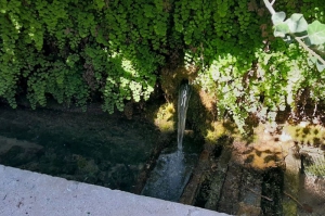 Au pied du chemin caladé, 100 m en contrebas, se cache une des plus anciennes fontaines de Gordes (il en est fait mention au milieu du XVIe s.). Cet ensemble fontaine-lavoir a la particularité d’être adossé à la falaise. L’eau ruisselle de la roche et trois canons alimentent la fontaine qui surverse elle-même dans le lavoir doté de ses deux bassins de rinçage et de lavage. Aujourd’hui inusité, les fontaines-lavoirs étaient jadis un point central de la vie au village, un lieu de socialisation essentiel.