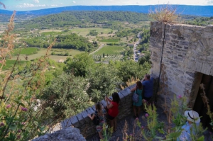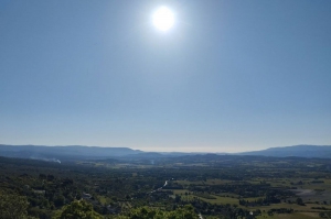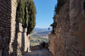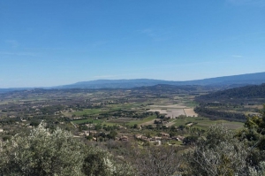 Un panorama à 180 degrés qui vaut le détour ! Depuis la bien nommée Rue du Belvédère, Gordes nous offre une vue imprenable. En bas, la plaine et la vallée du Calavon se déroulent, avec ses mosaïques de terres cultivées, d'habitations et de bois. Plus loin, le regard s'élève jusqu'au massif du Luberon : Grand Luberon sur la gauche, Petit Luberon sur la droite, et la Combe de Lourmarin entre les deux.