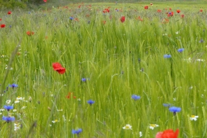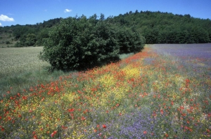 En plaine et dans les vallées, les milieux agricoles sont organisés en une étroite mosaïque paysagère. Cette infinité de paysages, intimes et secrets, forme toute l’identité du Parc du Luberon. Le maintien d’une agriculture encore largement extensive a permis la sauvegarde de nombreuses plantes messicoles (bleuets, adonis, miroirs de Vénus…), espèces associées aux cultures de céréales depuis des temps immémoriaux, mais en voie de disparition sur le territoire national.