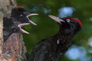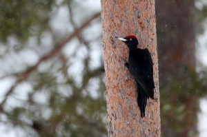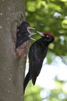 Le Pic noir (Dryocopus martius), est le plus grand oiseau de la famille des Picidés européen. Il se distingue des autres Pics par sa calotte rouge au-dessus de sa tête, et son pelage noir. Il privilégie les boisements de hêtres pour creuser ses cavités mais c'est aussi un grand amateur d'insectes, en particulier de fourmis. Lorsqu'il tambourine avec son bec, c'est avant tout pour avertir de la présence de possibles concurrents mâles et garder son territoire.