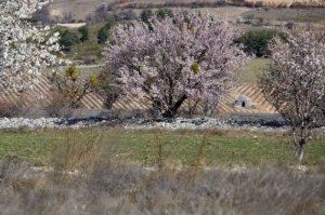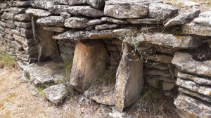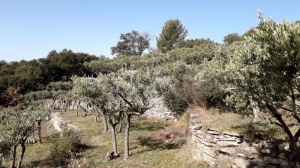 A flanc de colline, ici en amont du chemin, on devine encore divers éléments architecturaux en pierre sèche : terrasses de culture (bancau), cabanes (bories), citerne (aiguier), ruchers. En nivelant le sol, on permettait d'aménager le terrain pour faciliter les cultures locales (olivier, amandier, céréales notamment) tout en limitant le phénomène d'érosion. Tout le matériau des terrasses est ramassé sur place par épierrage du sol. Le surplus de pierre est ordonné en tas, appelé clapas. Rejeté aux extrémités non cultivables, il peut être utilisé ultérieurement.