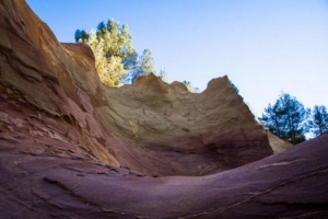 Vers -100 millions d’années, des mouvements tectoniques provoquent le retrait de la mer. Exposés à l’air libre sous un climat chaud et humide, les dépôts de grès verts subissent alors une intense altération. Les éléments comme le calcaire, les micas et la glauconie se transforment ou disparaissent, laissant place à la kaolinite, un minéral argileux, colorée par des composés de fer : un hydroxyde pour l’ocre jaune, un oxyde pour l’ocre rouge. Les grains de quartz restent majoritaires. Ainsi, le grès vert constitue la roche mère des célèbres sables ocreux du Pays d’Apt.