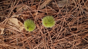 En contrebas dans le canyon, on devine quelques Châtaigniers. Ilot de sable siliceux au milieu des calcaires du Luberon, le massif ocrier abrite des essences d'arbres qui ne poussent pas dans le calcaire. Ainsi le châtaignier apprécie ce sol tout comme il apprécie le sol sableux dans le département du Var plus au sud.