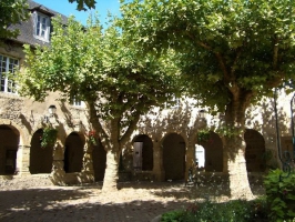 En 1345, un noble cède aux moines augustins des terrains sur la rive gauche du Lot, pour y établir chapelle, bâtiment et cimetière, autour desquels viennent s’agglomérer les maisons de la « ville neuve » (la ville ancienne étant construite sur la rive droite, sous le château et près de l’église paroissiale).La chapelle du monastère des Augustins, de style gothique, date du XIV ͤ s.A l'issue de la Révolution, les Pénitents Noirs, spoliés de leur chapelle, sont autorisés à y officier, à condition de ...changer de couleur de robe : les Pénitents choisissent alors le blanc et la Chapelle des Augustins prend le nom d’église des Pénitents.En 1938, on décide de l'agrandir en gagnant une travée sur l’ancien chœur des moines et d’ouvrir une porte côté rue de l’Hôtel de Ville. Les montants de cette porte, issus du vieux prieuré de Campagnac, sont offerts par le peintre Casimir Serpantié.L'édifice renferme un superbe triptyque daté de 1510, environ, et provenant d'Anvers.A la fin du XVI ͤ s., les ravages des Huguenots laissent le reste du monastère en très mauvais état. En 1620, Louis XIII et Richelieu, soucieux de maintenir l’unité du royaume, ordonnent la destruction du château qui domine la ville. Les moines sont alors autoriser à en utiliser les matériaux, et commandent à l'architecte Parate la construction de nouveaux bâtiments, formant un carré avec au centre un cloître. Le monastère abritera jusqu’à 25 moines.A la Révolution, les moines sont chassés du monastère et spoliés de leurs biens.Le maire d'alors les rachète et les cède à la commune, pour en faire la cité administrative.Le marché des producteurs de pays se déroule dans le cloître tous les samedis matin de l'année et le mercredi matin en saison.