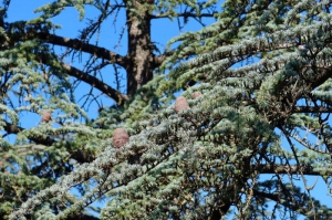 Ici en lisière de bois, se dresse quelques beaux sujets de cèdre de l’Atlas (Cedrus atlantica). Il n’est pas une essence forestière spontanée sur le Luberon. Originaire des montagnes du Maghreb (Atlas marocain et algérien), où il pousse entre 1300 et 2800 m d’altitude, il a été introduit à partir de 1860 dans les reboisements du sud de la France, dont sur les crêtes du Petit Luberon à 700 m d'altitude. Depuis, les premières plantations, les cèdres se sont ressemés spontanément et l’espèce colonise les garrigues et les taillis de chêne de l'ubac du Petit Luberon.