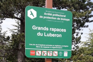 Quelque mètres plus-haut, se trouve la limite de l'arrêté préfectoral de protection de biotope (APPB), mis en place en 1990. Celui-ci préserve la tranquillité des rapaces par l'interdiction de la pratique de l’escalade, du slackline et des sports aériens (base-jump, parapente, deltaplane, ULM...), ainsi que la chasse photographique animalière et le survol en drone. En complément, la zone de protection spéciale des oiseaux (ZPS) du site Natura 2000 Massif du Luberon défini par arrêté ministériel, vise à y préserver la qualité des écosystèmes et leur remarquable biodiversité. Merci de rester le plus discret possible afin de préserver la quiétude des rapaces qui nichent et vivent sur le massif.