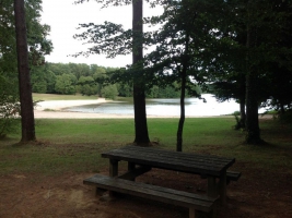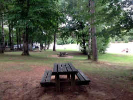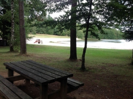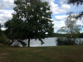Nombreuses tables de pique-nique à disposition tout autour du lac du Coiroux, côté plage à l'ombre des arbres, ou côté Lac.