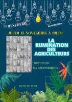 LA RUMINATION DES AGRICULTEURSTHÉÂTRE DISCUSSIONJEU 13 NOVEMBRE - 19H09 | TOUT PUBLIC LA MENUISERIEAvec Les ArcamédiensUne pièce émouvante, porteuse de sens et d’espoir faite de scènes de vie actuelles des agriculteurs, qu’elles soient tragiques, émouvantes ou drôles ; le sujet c’est surtout la force du partage et de l’entraide.AU POTCH