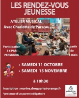 Charlotte de Parscau, chanteuse et médiatrice artistique, propose aux enfants et leurs parents un atelier musical le samedi matin à la Droguerie d'en face.Un moment pour écouter, explorer, chanter, jouer et s'amuser avec la musique.Durée : entre 45 min et 1hA partir de 18 mois5 euros par participantPrésence d'un parent obligatoire