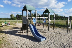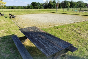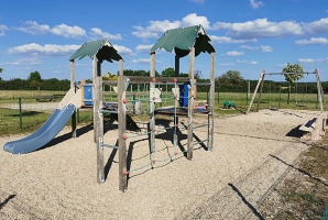 Aire de jeux avec balançoire, toboggan, bac à sable, terrain de pétanque, table pique-nique et bancs ...